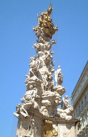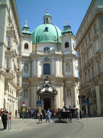 ペスト記念柱は中世ヨーロッパを襲ったペスト禍が去ったことを記念して建てられた記念碑で、頂には三位一体像が光っている。ここは歩行者天国でちょっと高そうな店が並ぶ商店街である。少し横に入るとペーター教会がある。と言ってもこの教会を知っているわけではないが、案内板によるとウィーンで二番目に古い教会らしい。シュテファン寺院南塔から見える緑色の丸い屋根のあの教会である。中に入るとここもミサ中であるが、特に鉄格子で区切られている訳ではない。司祭の話す言葉に耳を傾けたが、どうもドイツ語のようである。ラテン語でやっている訳ではないんだな、と思った。