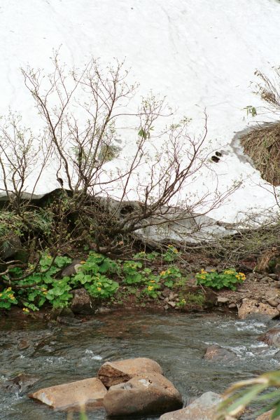 湿原手前の残雪とエゾノリュウキンカ |