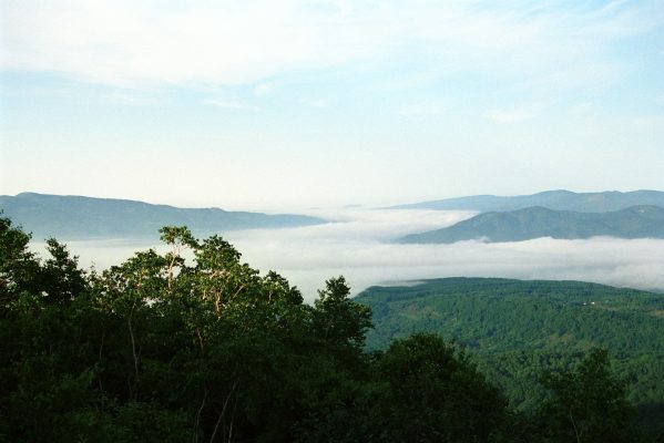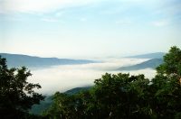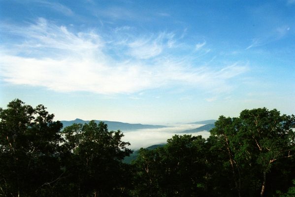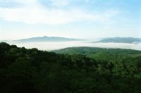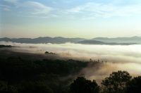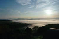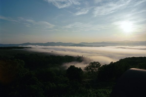 外が明るいので目がさめた。時計を見るとまだ4時30分、北海道の夜明けは早い。何気なく外を見てみると「ワーォ!!!!!!」ホテルは雲海の上にあった。 |