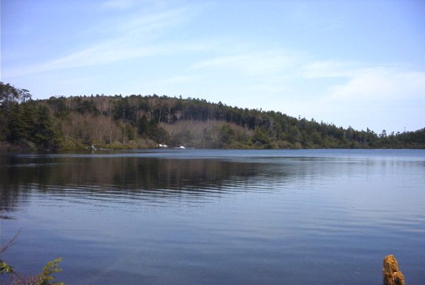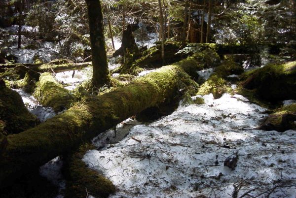 白駒池に続くハイキングコースは、苔むした倒木がとてもきれいだ。あとひと月もすれば雪が完全に消え、手軽に花を楽しめるようになるのだろう。 |