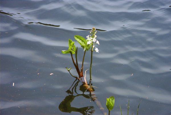 目的のミズバショウを求めて戸隠森林植物園を訪れた。駐車場近くのみどりが池には、ミツガシワの花が咲いていた。 |