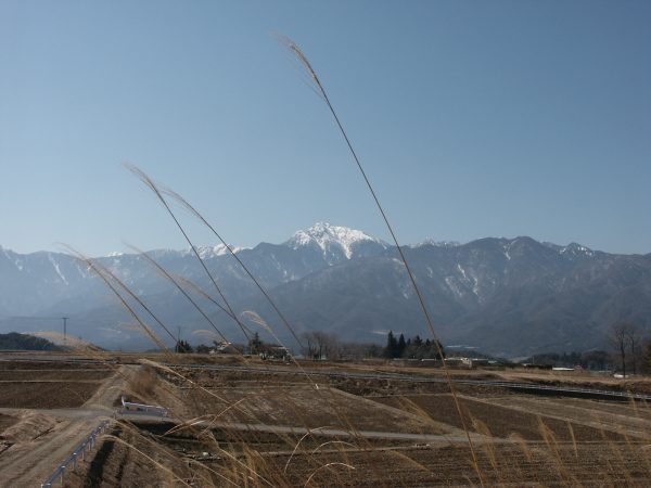このあたりを馬場の里というらしい。甲斐駒ケ岳や、南アルプス、この日のように天気がよいと富士山や、北アルプスの山々を望むことが出来る。ビデオクルーがいたので何を撮っているのかと思ったら、荒川じんぺいさんという方のCS用里山歩き番組の撮影ということだ。 |