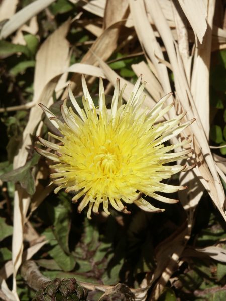 セイヨウタンポポが全盛だが、ニホンタンポポを見つけることができた。花の色がちょっと薄く、外側の花弁(額?)が白っぽい。撮っているときは気づかないものだが、バックをきちんと整理して撮れば花にもっと立体感を出せるのだが… |