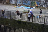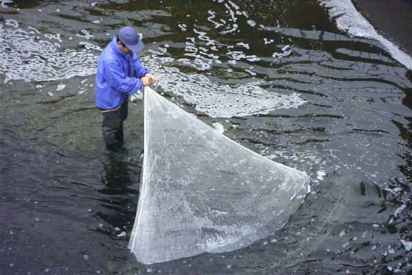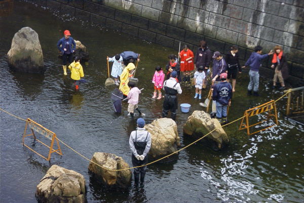 目黒川沿いに下ってゆくと、船着場公園のところで川に入っている人たちがいた。投網を投げている人がいたり、水槽がおいてあるところを見ると魚の調査をしているようだ。近頃では鮎の遡上も見られるということだが、どんな魚がいたのだろう。