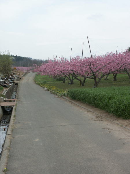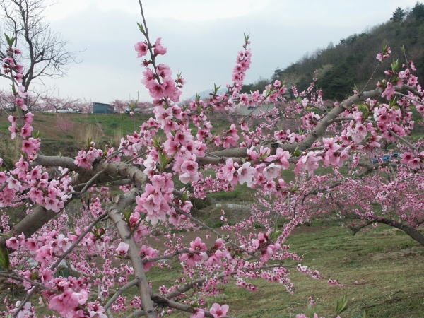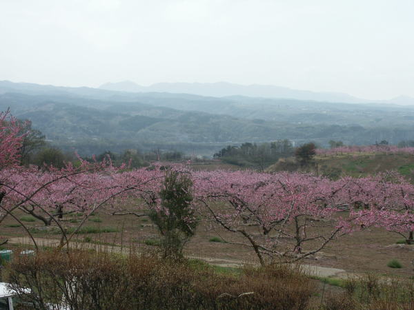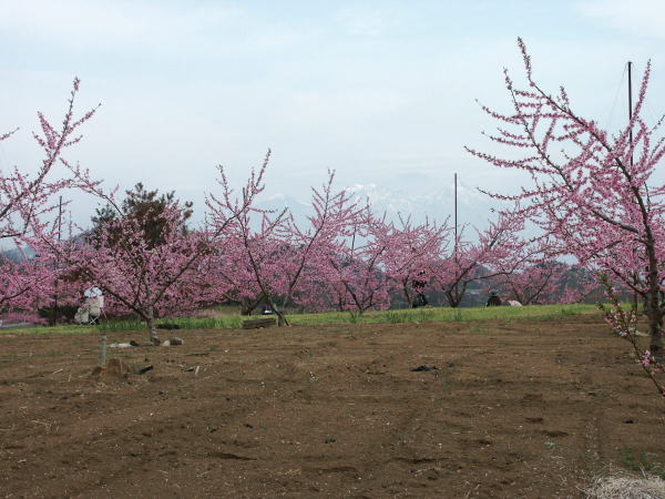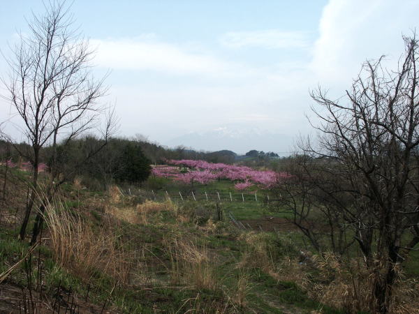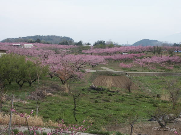 モモが花盛りとの情報を得て新府のモモ畑へ行った。新府は長坂から韮崎方へ面へ行ったところで、武田勝頼の居城があった場所だ。