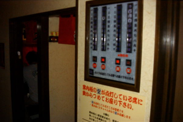 ![]() Webでさがした一蘭はちょっと変わったラーメン屋さん。うんちくはお店のHPでものぞいてください。右写真のパネルで空いている席がわかり、そこへ座る。つまりこのパネルが案内係。 |