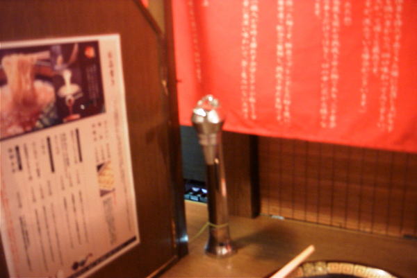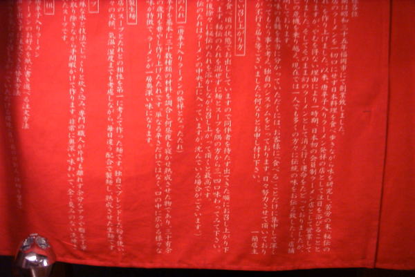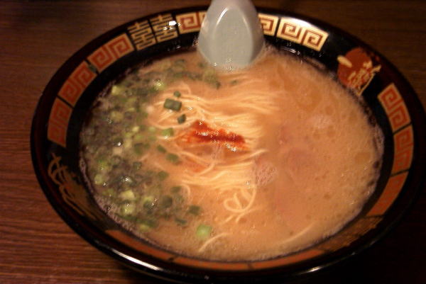 | 多くの支店があり、すべての店がこのような仕切りにはなっていないそうだが、幸い太宰府店では名物の仕切りを見ることができた。 ラーメンは評判どおりおいしい。味も濃すぎず、くどすぎず。まん中に赤く見える「秘伝のたれ」が、ピリッとしておいしい。 ラーメンだけでも再訪する価値はあるが、このシステム自体必見なので、機会があれば是非行って見るべき。 |
