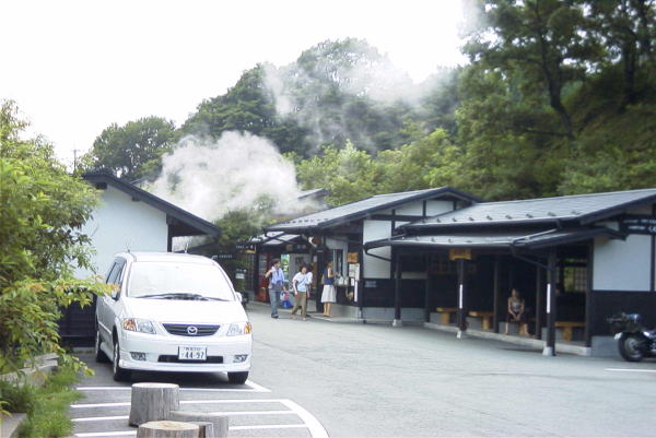 | 本日の温泉は熊本県小国町はげの湯温泉。コイン式家族風呂で有名なくぬぎ湯へ入ることにした。お風呂は眺めのいい半露天。四人くらいゆったり入れる広さで、1200円入れると40分お湯が出つづけるシステムだ。5分ほどで湯船がいっぱいになり、わずかに硫黄臭のある温泉を堪能することができる。 土曜日のためか多くのお客さんが訪れていたが、幸い待たずに入浴することができた。 |