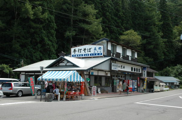 | 昼食は湿原のそば、新行の美郷へ行った。新行が蕎麦の里であることは知っていたが、以前立ち寄った店は特別おいしいという感じではなかったので、最近は来たことがなかった。 インターネットでそば神と同様によい評判があったので、今回はじめていってみることにした。結果は大正解。 もりを頼んだのだが、そば羊羹、漬物、蕎麦クレープが出される。そば羊羹は蕎麦湯を固めたもので、甘いのでそれほどおいしいという感じではなく、ただ珍しいだけ。漬物はおいしい。 蕎麦クレープは乗っているねぎ味噌との相性がよく、Good! もりは量が大目で、葉っぱのてんぷらが添えられている。蕎麦自体は少し短めながら絶品! 店には運良く待たずには入れたが、昼時は行列必至と覚悟をしたほうがよさそうだ。 |