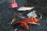 N社長のこの日の釣果。イトヨリダイ、カワハギ、トラギス、オニカサゴ、ホウボウ。このほかに鯵もあった。カワハギ、トラギス、ホウボウ、鯵をお刺身に、鯵はそのほかなめろうにして、オニカサゴは味噌汁になった。すべて絶品の大満足、オニカサゴの味噌汁も本当においしかった。おいしい魚にはおいしい焼酎ということで持っていった伊佐美も好評だった。 |