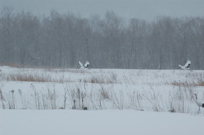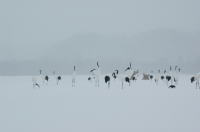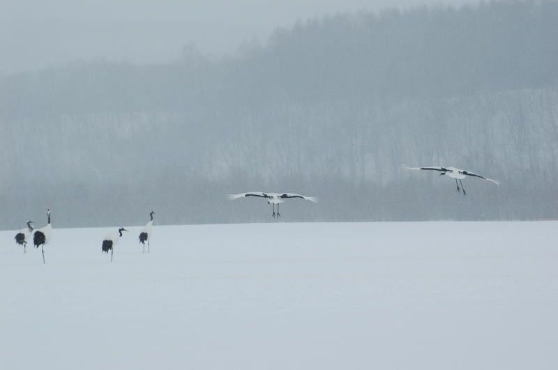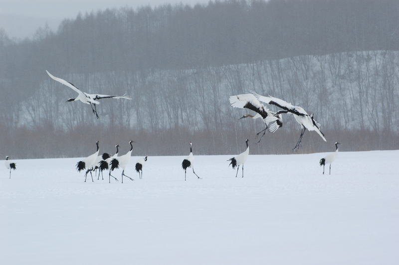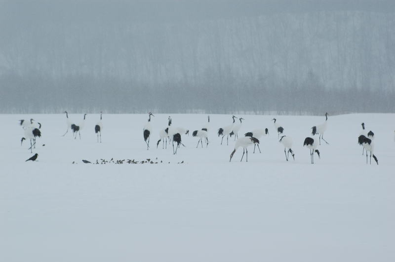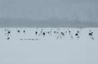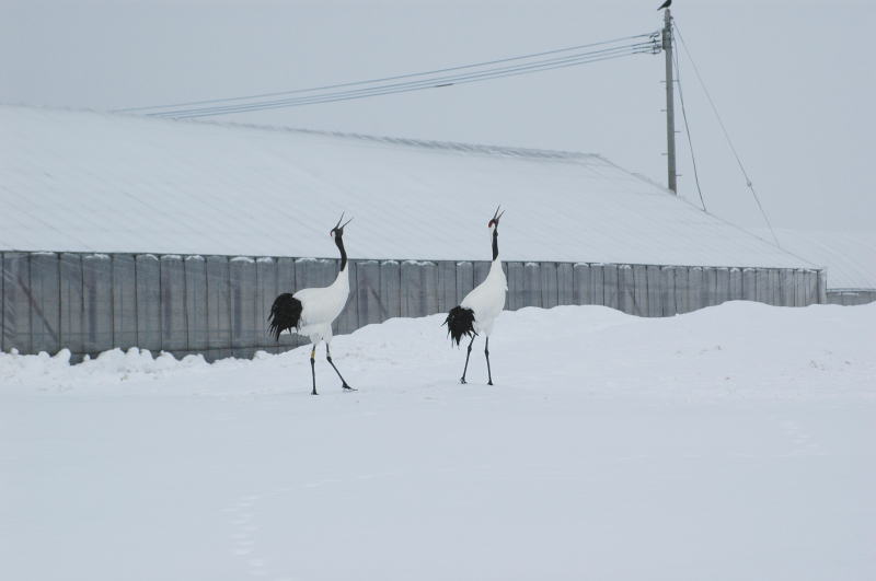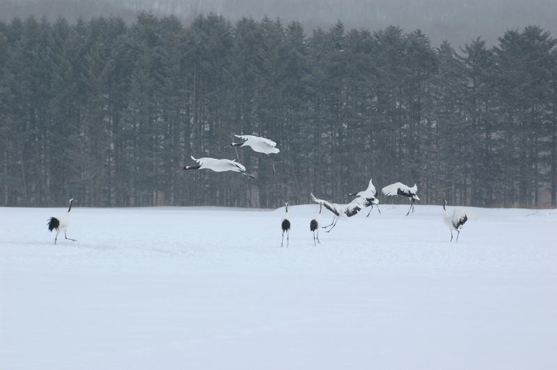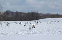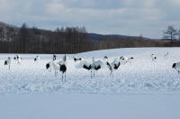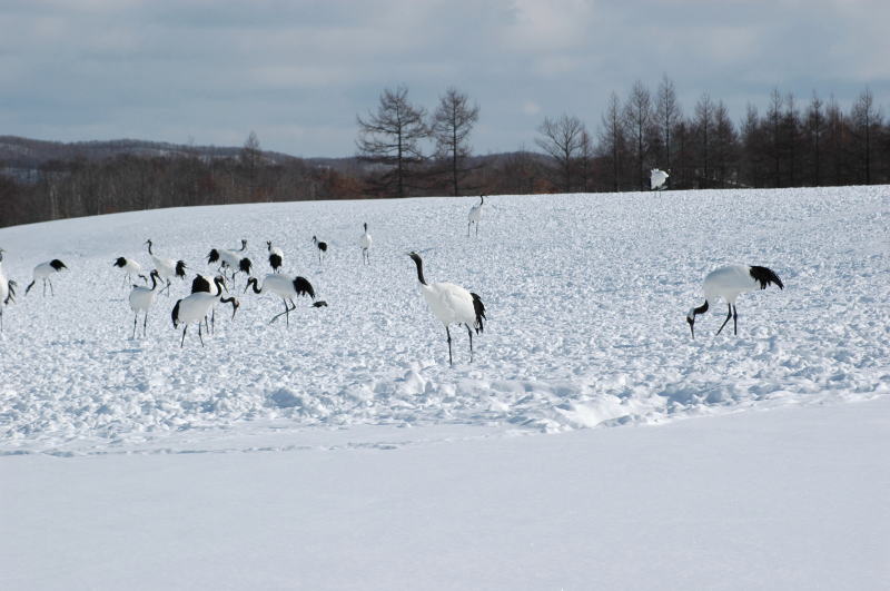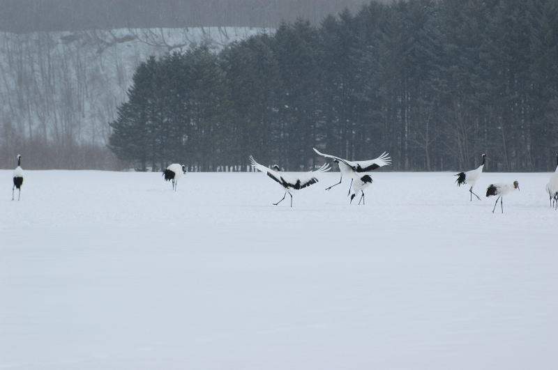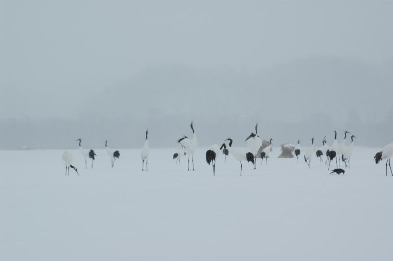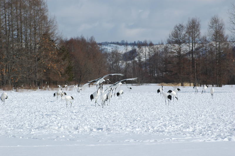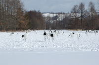 最初の目的地は阿寒国際鶴センターグルス。釧路空港から約16Km。空港が釧路のはずれにあるためすぐに阿寒町に入る。小雪の降るあいにくの天気だったが、最前部はカメラマンが陣取り望遠レンズと、三脚の品評会のようだ。寒さの中でD70がきちんと動くかどうか心配をしていたのだが、カメラの動作にはまったく問題は無かった。気温が0度前後と思ったより寒くなかったせいだろうか?手持ちのレンズの中で最も焦点距離の長い90mmマクロレンズ(135換算で135mm)を使用して撮ったのが下の写真だ。丹頂は50mくらい離れたところにいるので、この焦点距離ではちょっと物足りない。特定の鶴をねらって撮っても他の鶴が入ってしまうために、テーマが絞れない写真になってしまった。来年はもっと長いレンズを買って再挑戦をしたいところだが、鳥を撮るためにレンズを買い始めるとお金がいくらあっても足りない。まあこのくらいの写真で我慢をしておくべきか? |
