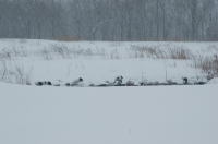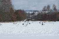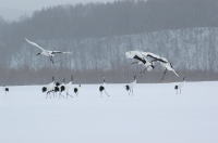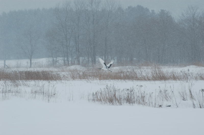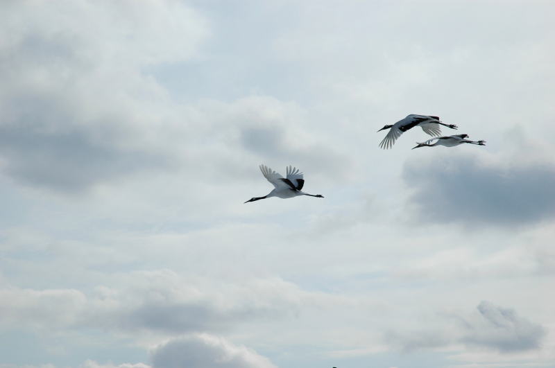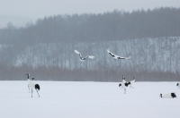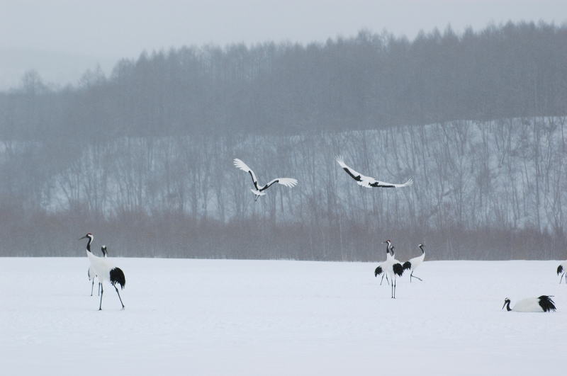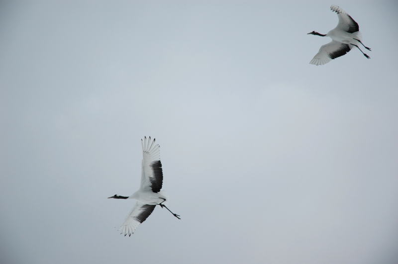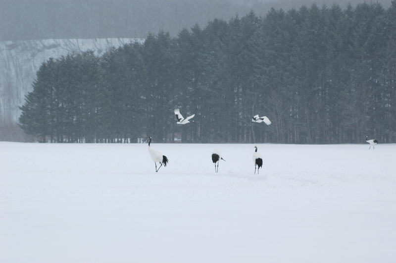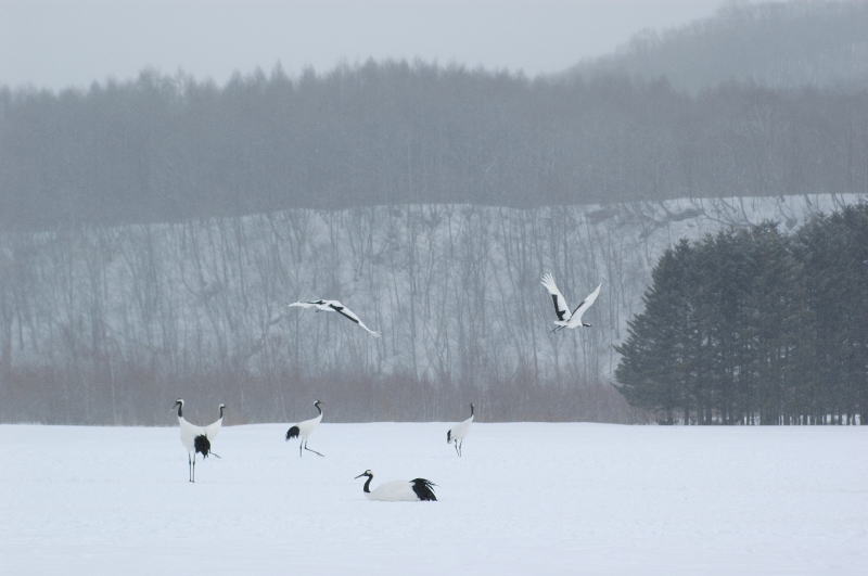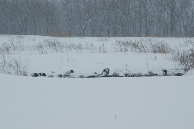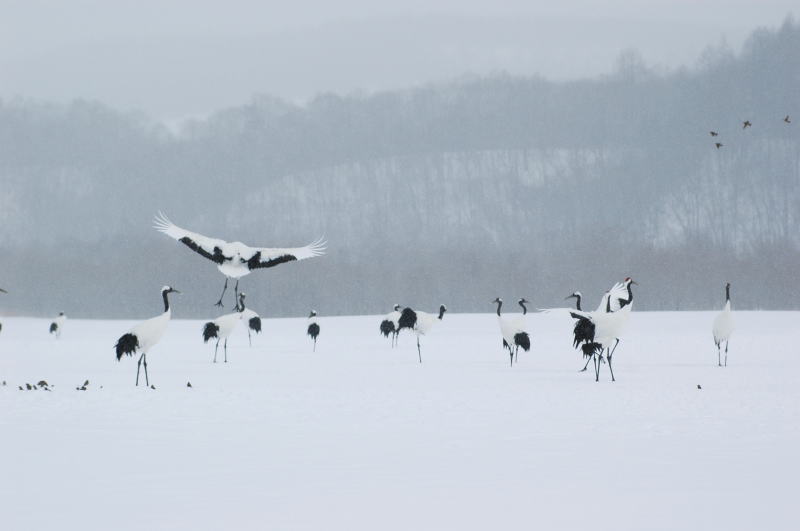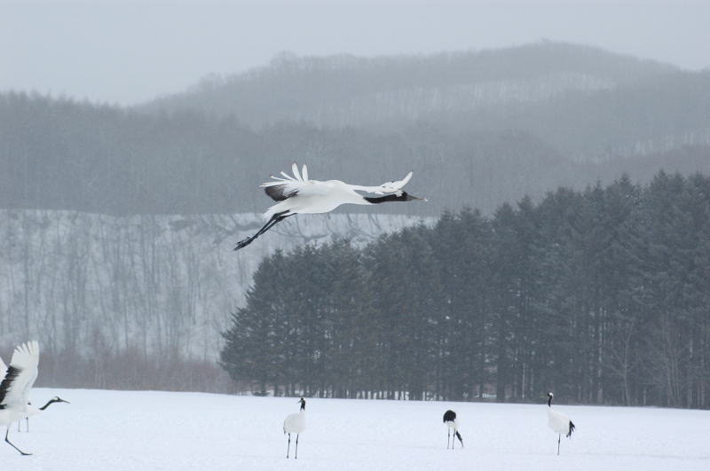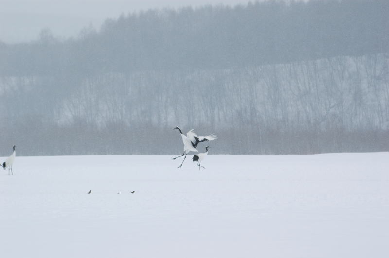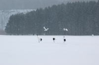 最初の目的地は阿寒国際鶴センターグルス。釧路空港から約16Km。空港が釧路のはずれにあるためすぐに阿寒町に入る。小雪の降るあいにくの天気だったが、最前部はカメラマンが陣取り望遠レンズと、三脚の品評会のようだ。寒さの中でD70がきちんと動くかどうか心配をしていたのだが、カメラの動作にはまったく問題は無かった。気温が0度前後と思ったより寒くなかったせいだろうか?手持ちのレンズの中で最も焦点距離の長い90mmマクロレンズ(135換算で135mm)を使用して撮ったのが下の写真だ。丹頂は50mくらい離れたところにいるので、この焦点距離ではちょっと物足りない。特定の鶴をねらって撮っても他の鶴が入ってしまうために、テーマが絞れない写真になってしまった。来年はもっと長いレンズを買って再挑戦をしたいところだが、鳥を撮るためにレンズを買い始めるとお金がいくらあっても足りない。まあこのくらいの写真で我慢をしておくべきか? |