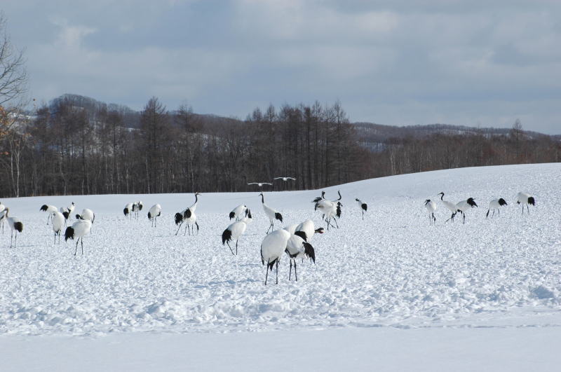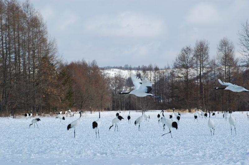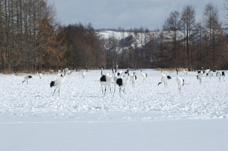 | 本日二箇所目の鶴ポイントは鶴居村にある伊藤タンチョウサンクチュアリだ。丹頂の数は国際鶴センターと同様だが、こちらのほうが開放感を感じることができる。カメラマンにとっては背景などの関係でどちらがよいということになるのだろうが、丹頂を見に行くにはどちらも味があり両方楽しみたいところだ。 | ||||||||||||||||||||||||